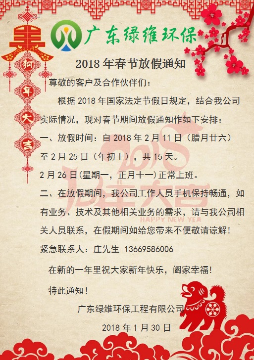 狗年大吉,恭賀2018新春廣東綠維環(huán)保工程公司元旦放假安排