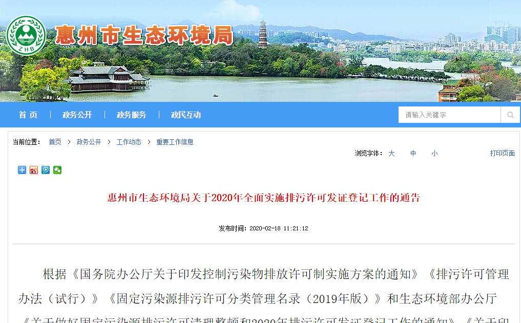 惠州市生態(tài)環(huán)境局關(guān)于2020年全面實施排污許可發(fā)證登記工作的通告