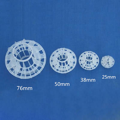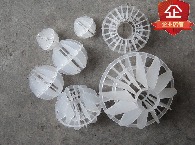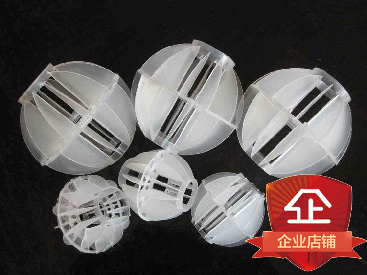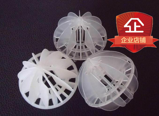 多面空心球采用聚丙烯(PP)塑料制成球狀,由兩個(gè)半球合成一個(gè)球形,兩個(gè)半球的扇形葉片相互錯(cuò)開(kāi)。該填料特點(diǎn)是比表面積大,空隙率較高。但是由于葉片數(shù)偏多,彼此間有遮蔽效應(yīng),不利于液體分布和潤(rùn)濕;液體大多在球體空心柱聚集,阻礙氣體暢通,因此阻力較大。重量輕、強(qiáng)度高、自由空間大、耐高溫、耐腐蝕、表面親水性能好、風(fēng)阻小、電耗少、比表面積大且適應(yīng)多種溶劑的處理裝置。此種填料多用于水處理工程廣泛應(yīng)用于除氯氣、除氧氣、除二氧化碳吸收塔、廢氣凈化塔、酸霧凈化塔等環(huán)保設(shè)備中。