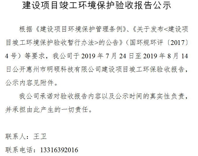 惠州市明碩科技有限公司建設(shè)項(xiàng)目竣工環(huán)境保護(hù)驗(yàn)收?qǐng)?bào)告公示