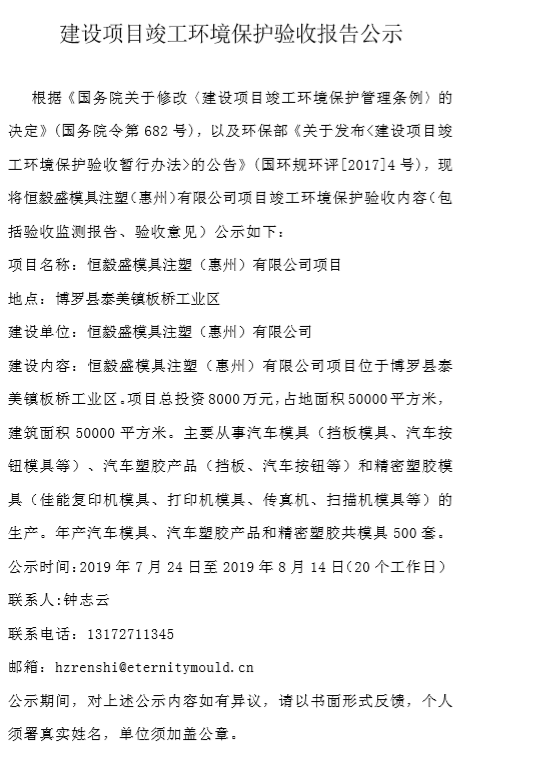 恒毅盛模具注塑(惠州)有限公司建設(shè)項(xiàng)目竣工環(huán)境保護(hù)驗(yàn)收?qǐng)?bào)告公示