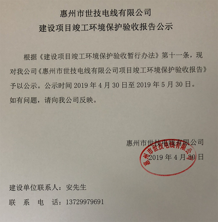 惠州市世技電線有限公司建設(shè)項目竣工環(huán)境保護(hù)驗(yàn)收報告公示