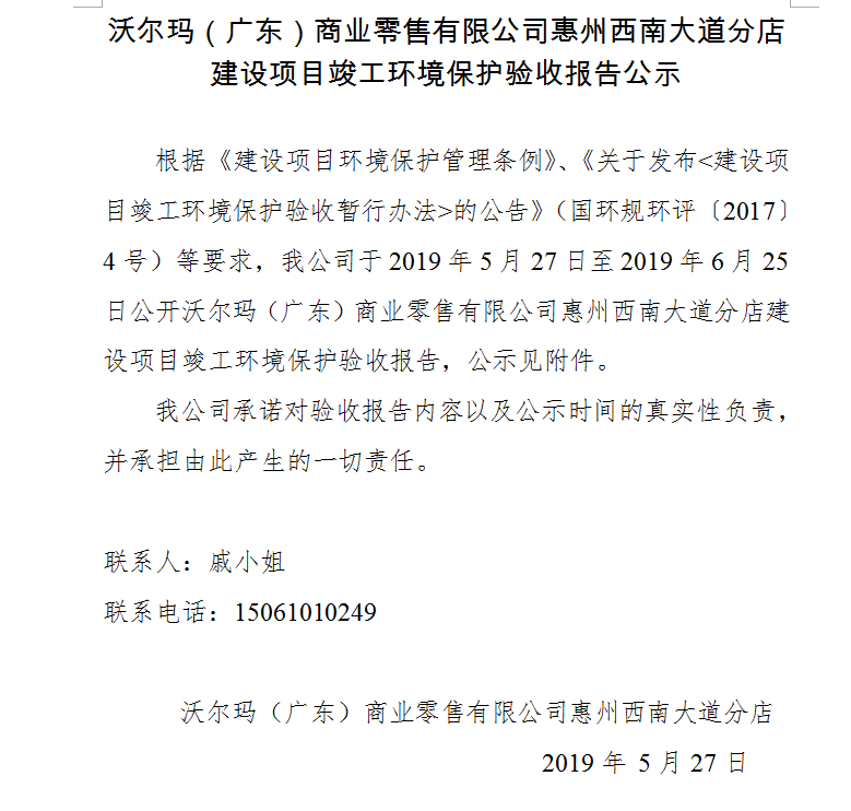 沃爾瑪(廣東)商業(yè)零售有限公司惠州仲愷大道分店 建設(shè)項目竣工環(huán)境保護(hù)驗(yàn)收報告公示